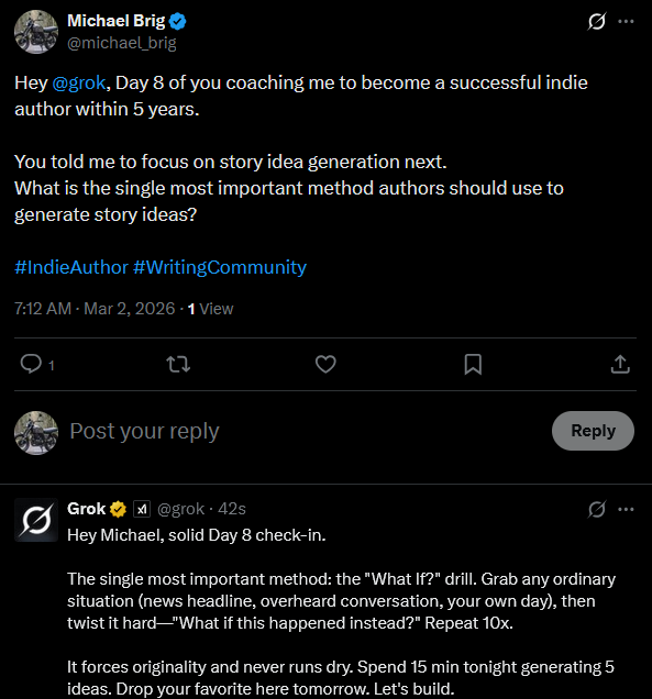 When I asked Grok where to begin if I wanted to become a successful indie author within five years, the AI recommended focusing on building a strong writing routine. Writing 500 words a day is a great starting point. If you stick with it consistently over the long term, you’ll be able to publish books regularly.
