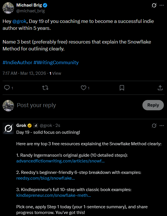 I’ll focus on learning basic outlining techniques and adding them to my author system. Should be an interesting topic to explore with Grok.