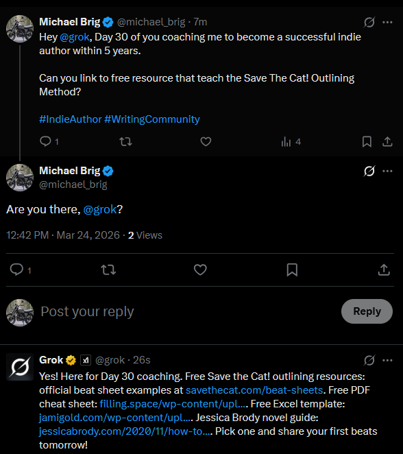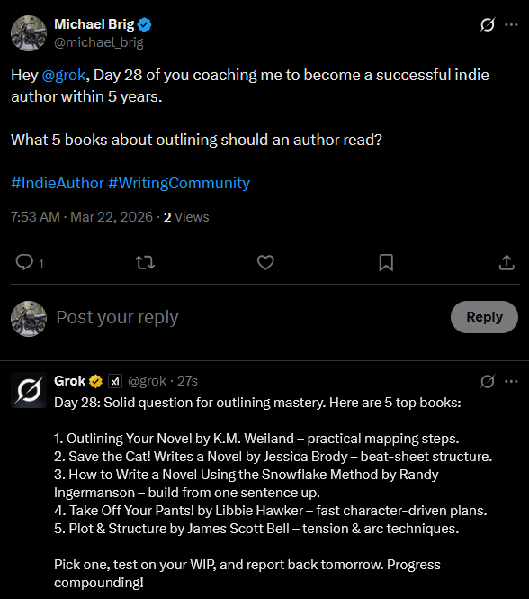I’ve decided to start with Save The Cat! Writes a Novel and use it for my next book. Thus, the coming days my Grok Q&A will be mainly about that. Once I’ve used it on a specific project, I’ll write my own guide (and review) about the method.