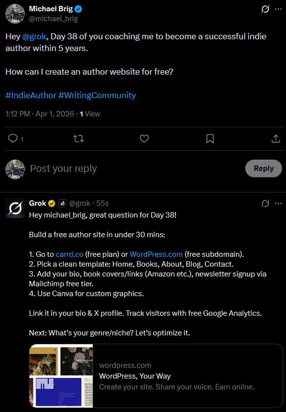 Thus, I manually changed the topic. Building a website for authors is next. Grok should have great advice for that.
